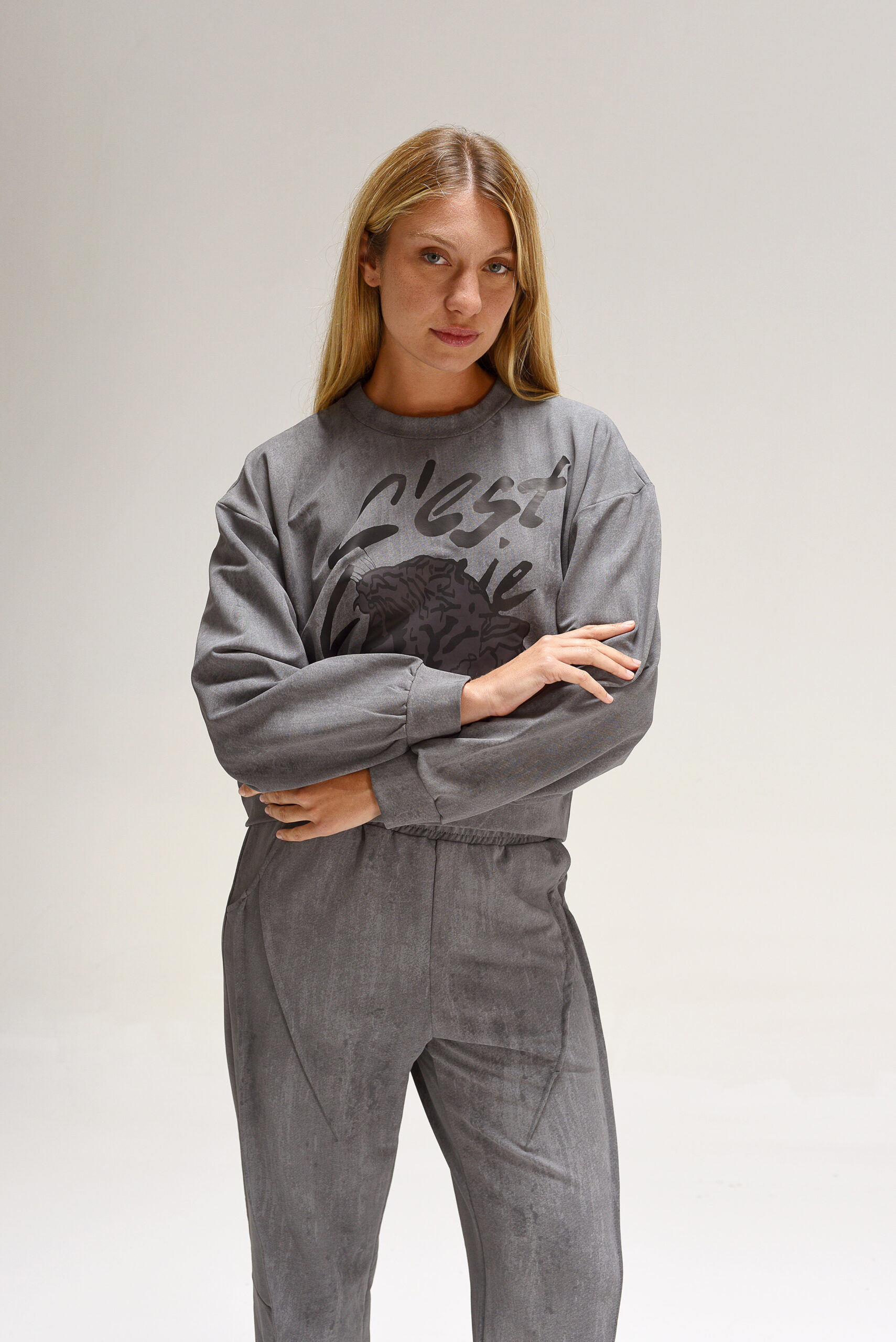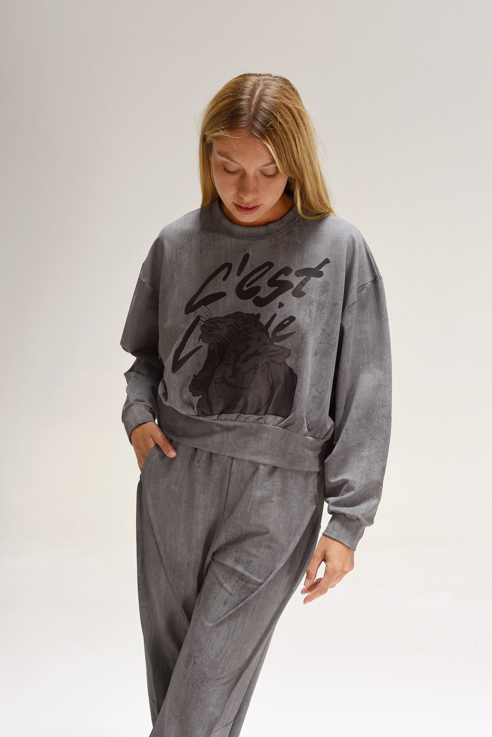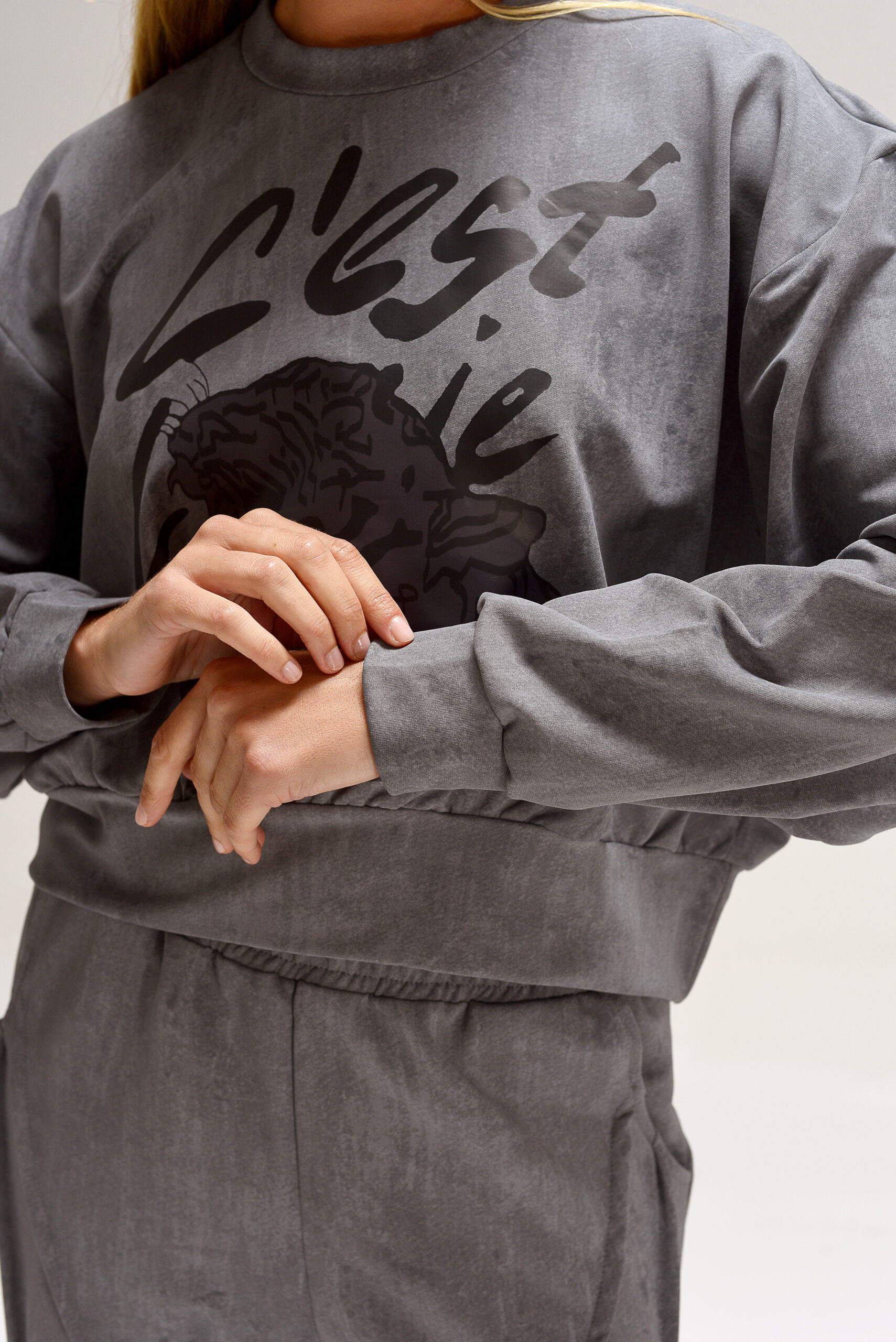 Buzo corto overzise, mangas caídas. Estampa central en DTF.