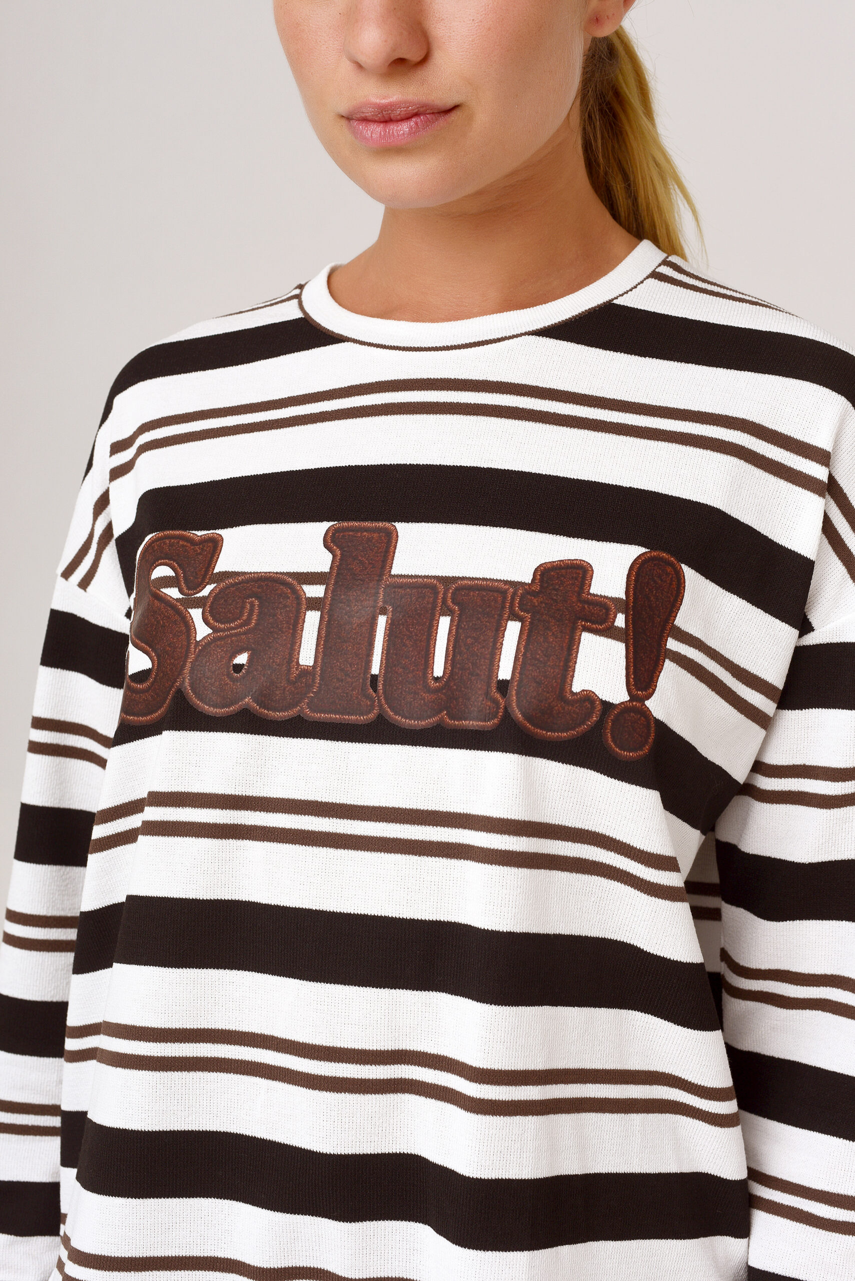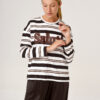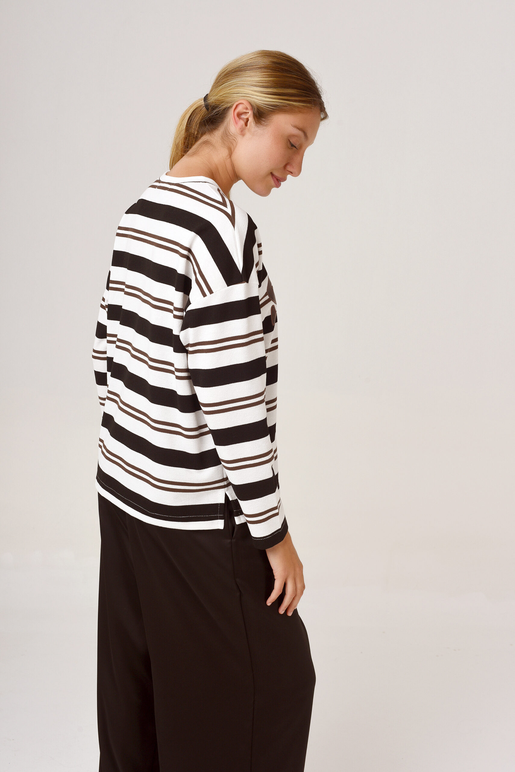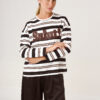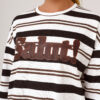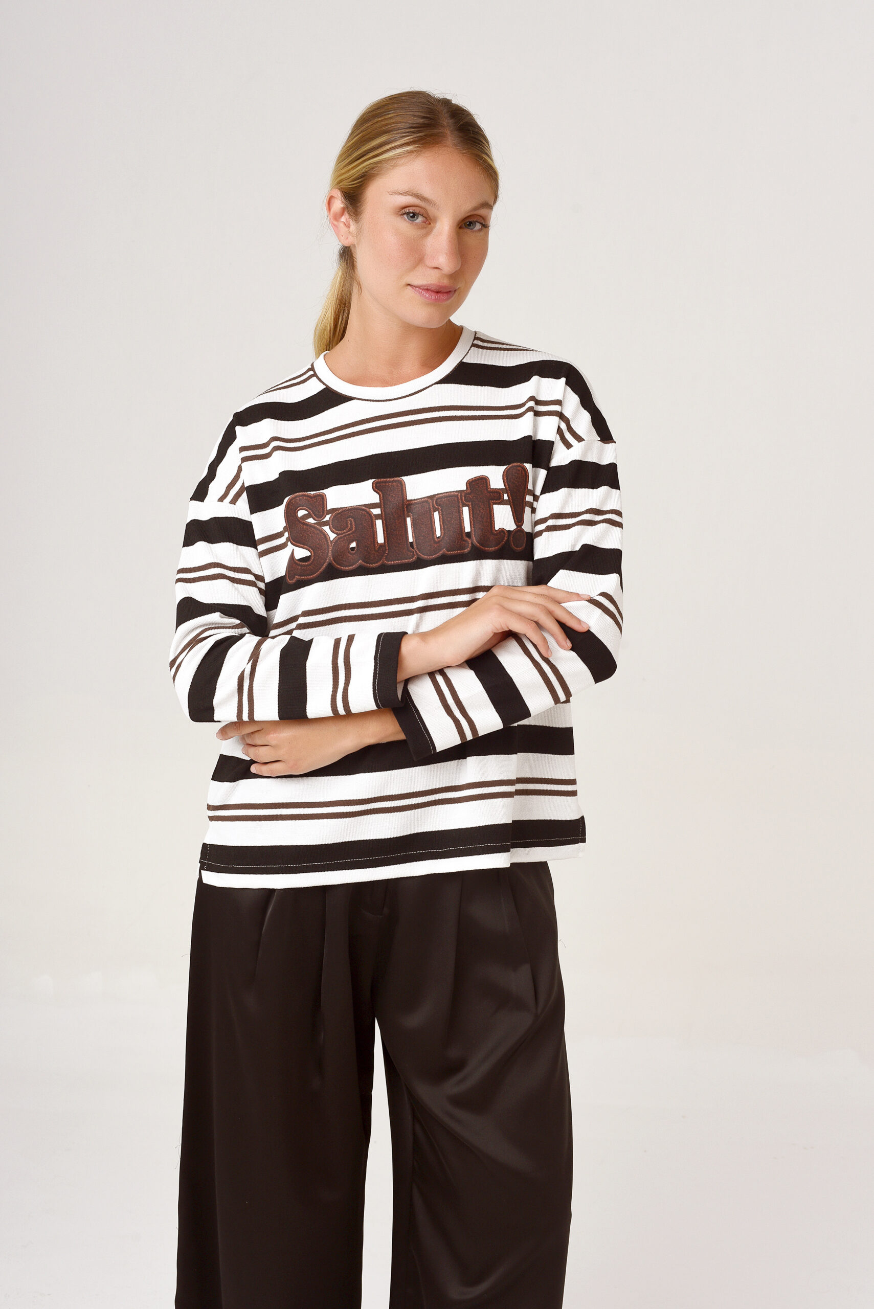 Remera manga larga, escote redondo, que combina rayas con estampa propia de DTF en la delantera.